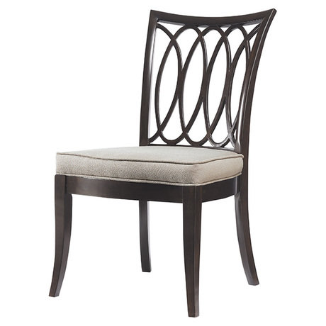 Обеденный стул с широкой мягкой подушкой сидения и узорчатой спинкой станет красивым предметом мебели современного интерьера. Модель выполнена в массиве дерева и ткани светлого оттенка.