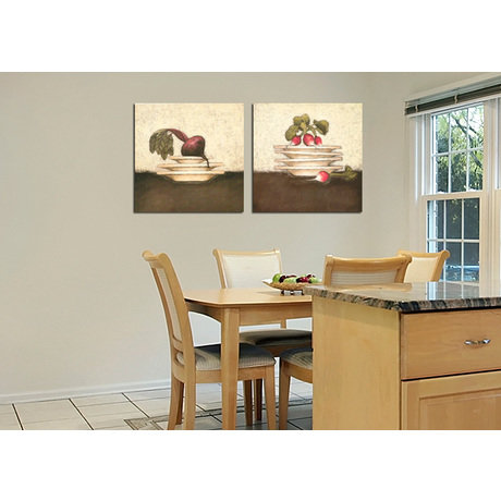 Забавный диптих с изображением корнеплодов с тарелками оживит пространство интерьера. Поскольку изображения натюрмортов всегда было принято размещать в столовой или на кухне, то такой натюрморт можно разместить где угодно, все зависит от Вашего чувства юмора